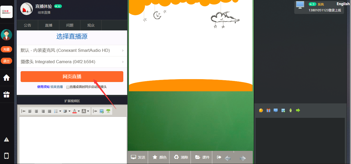 可以直播桌面,摄像头,同时可以打开文件进行讲解,所有点画操作会同步直播给用户....